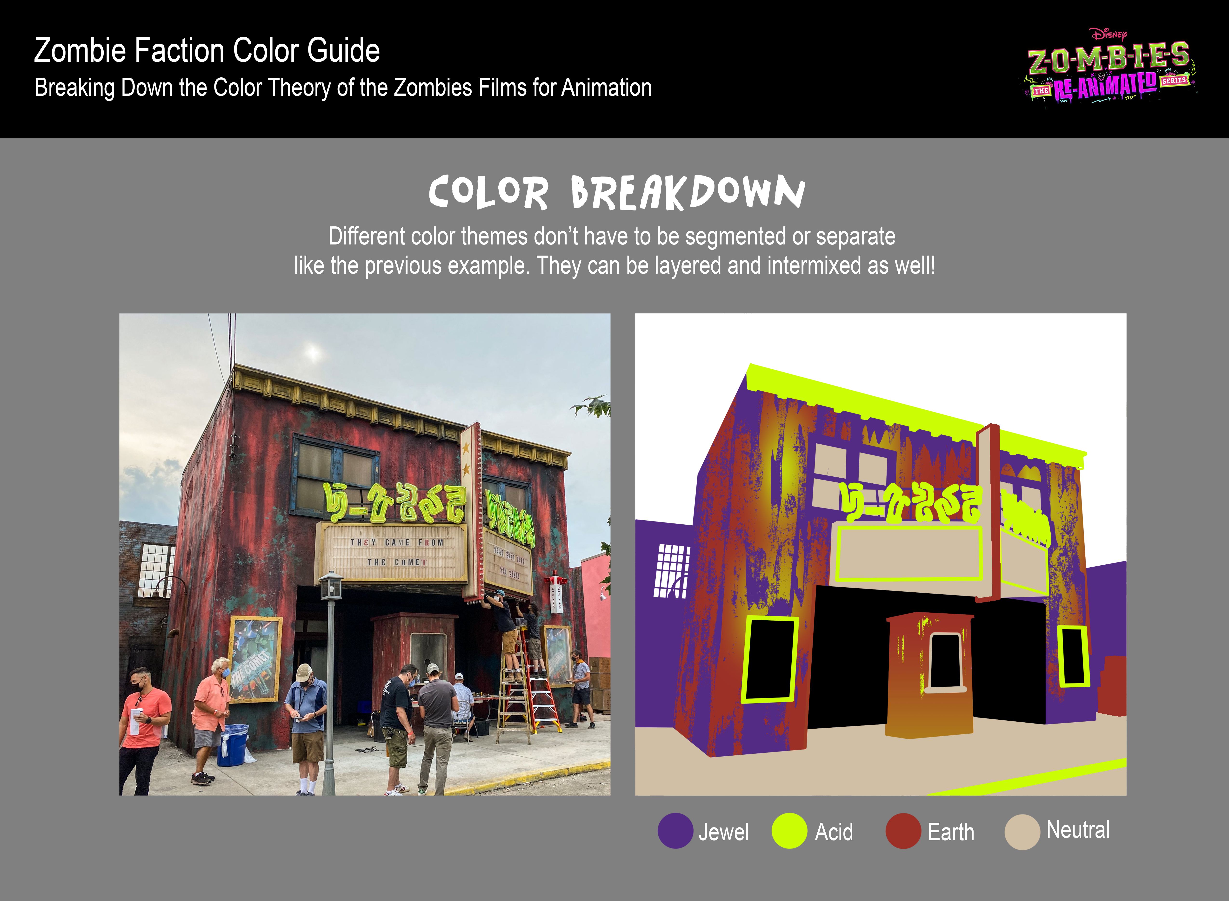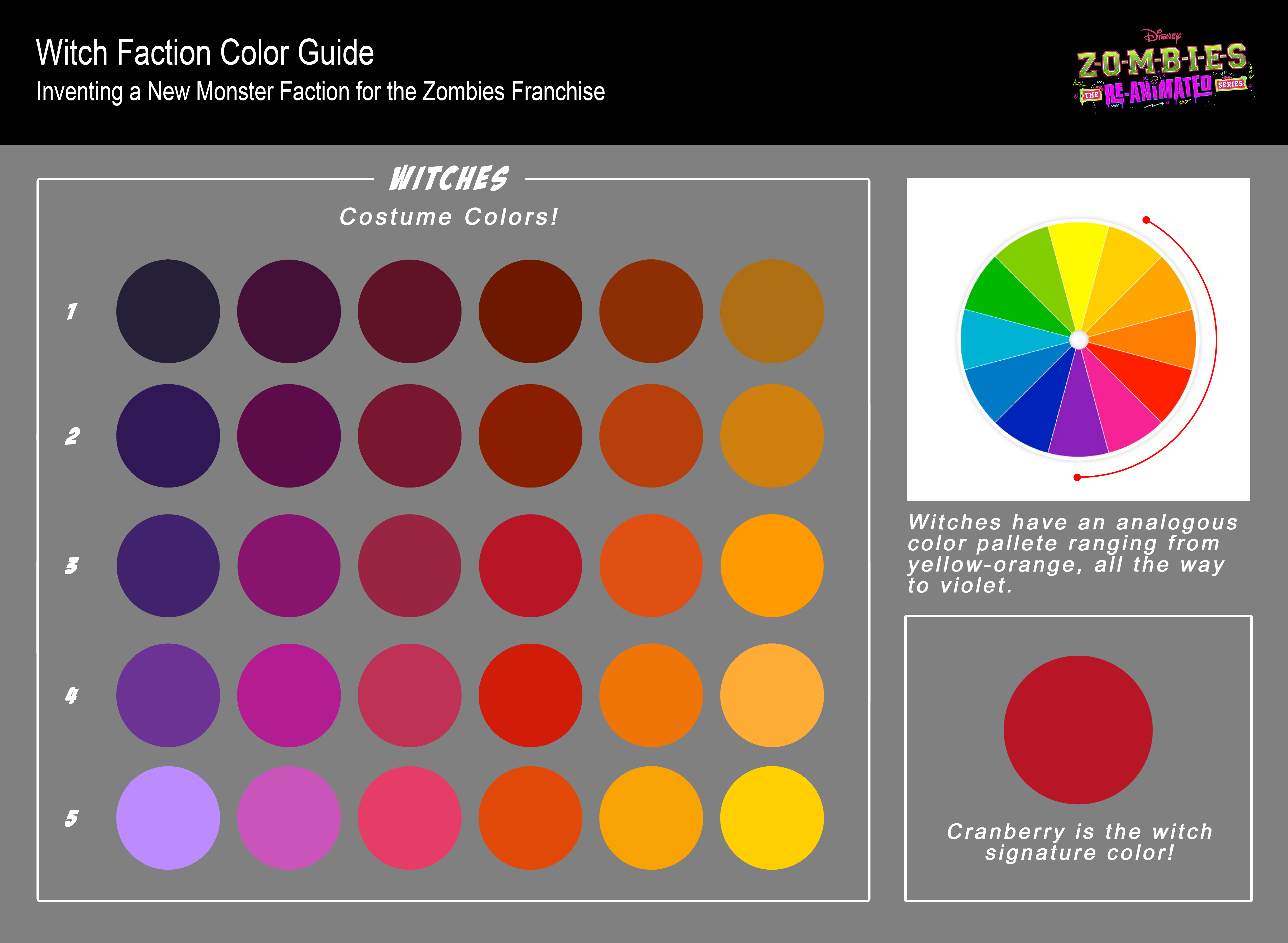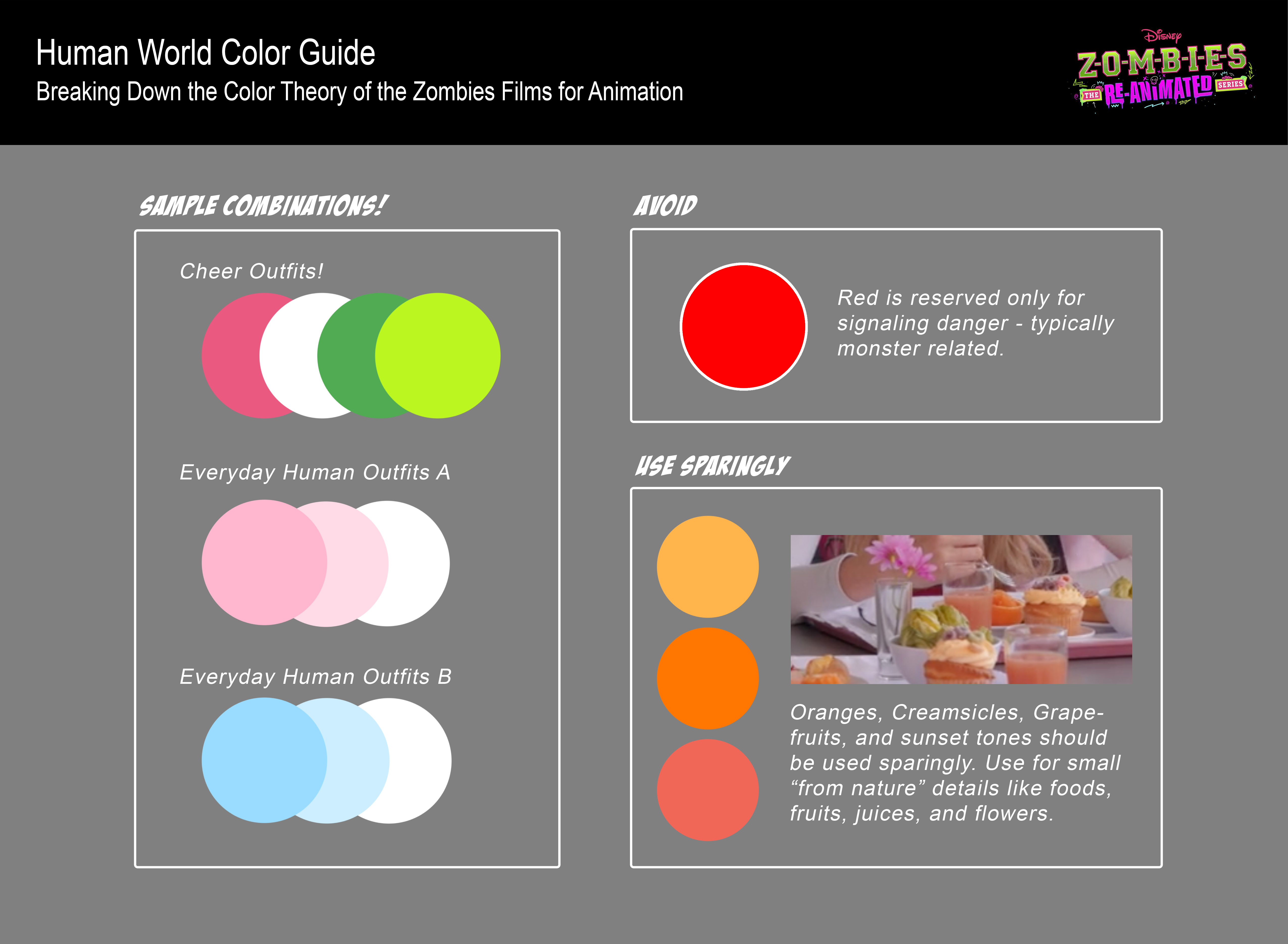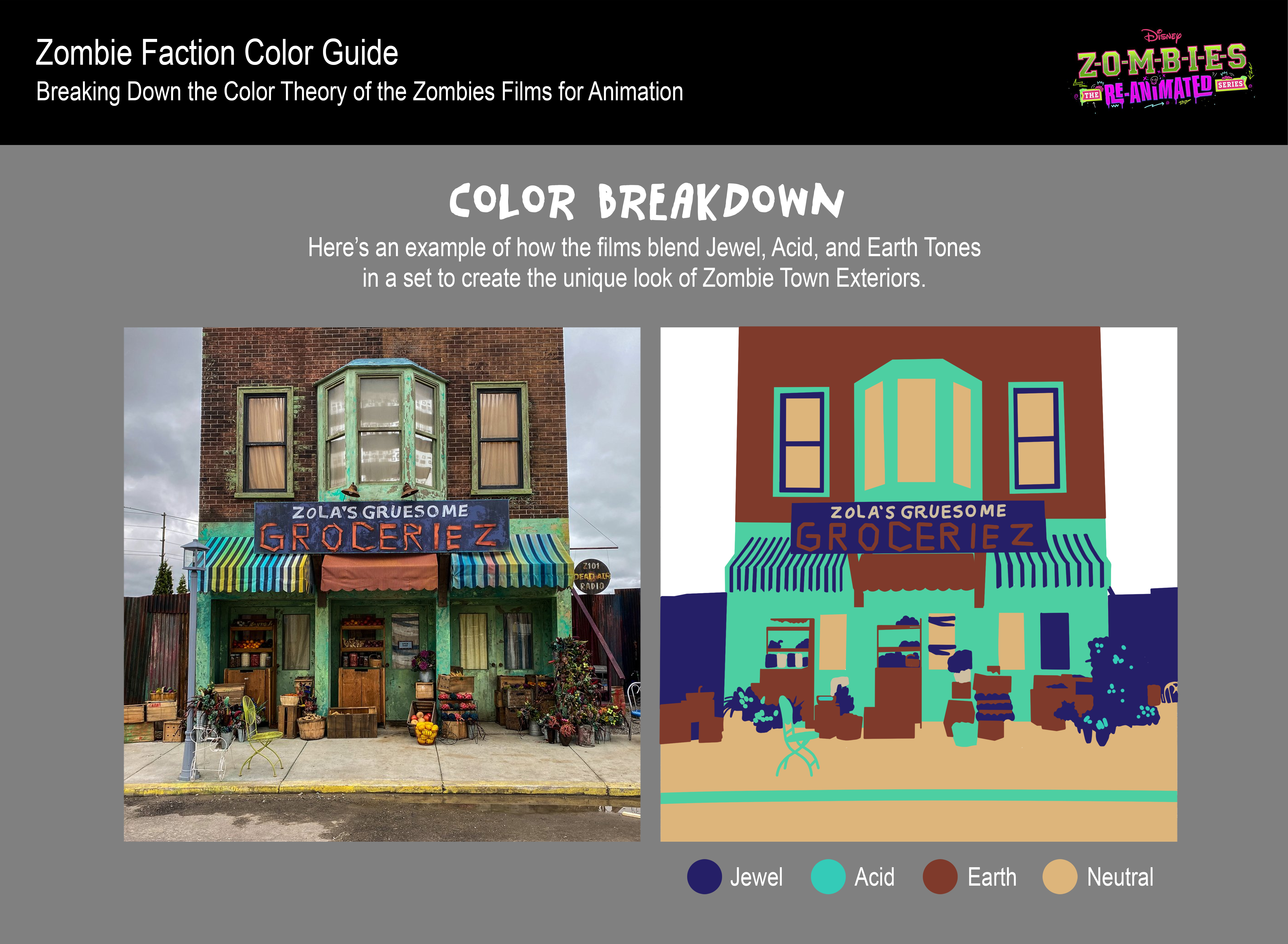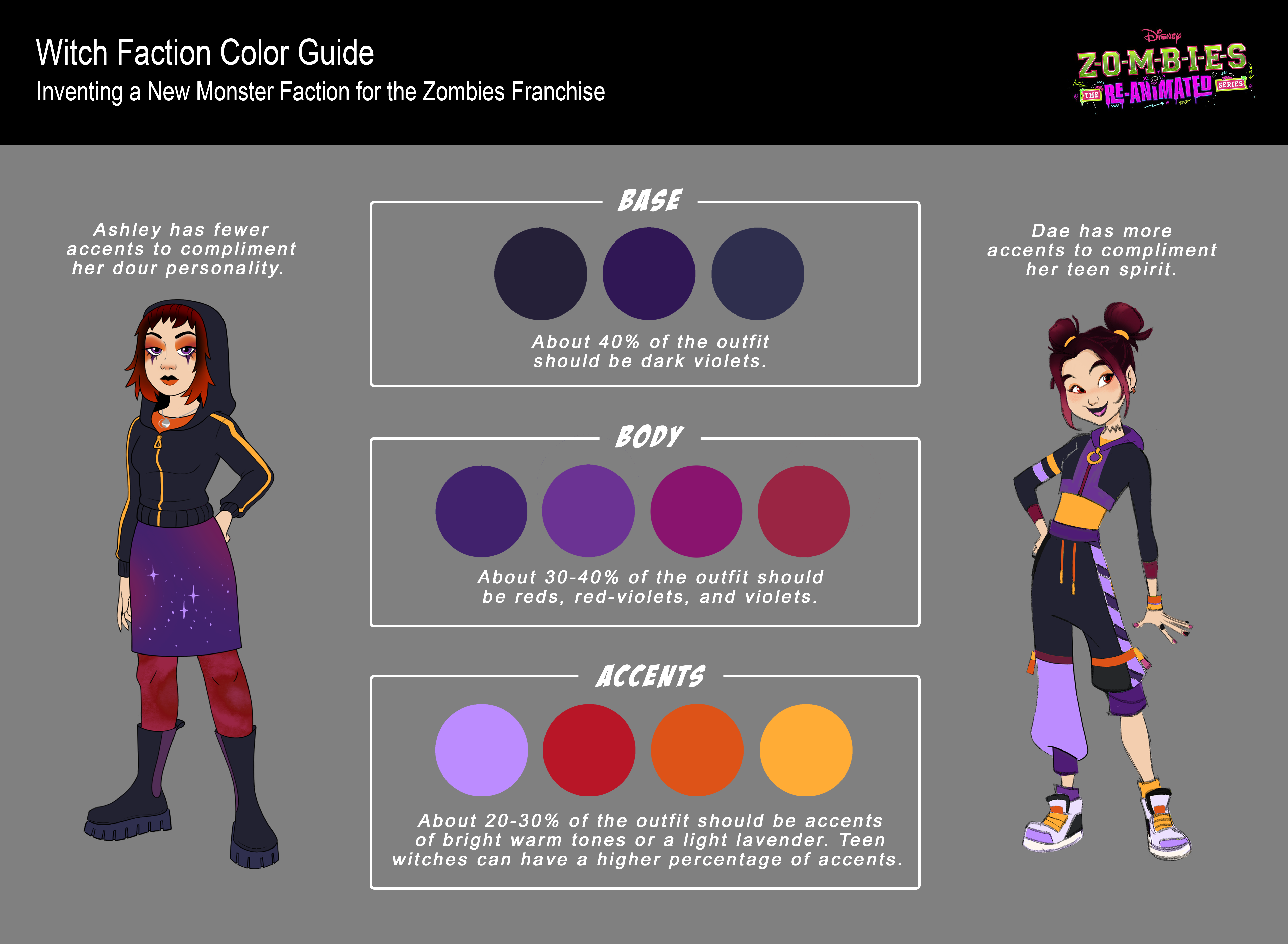 As we expanded the world of Zombies, it became clear we needed a unified color theory and design system to ensure each "faction" – Humans, Zombies, Werewolves, Aliens, and Witches – had distinct, instantly recognizable visual identities. I reverse-engineered the live action films’ color logic and created a series of color guides for our partner studio, removing as much guesswork as possible and helping streamline the design process.