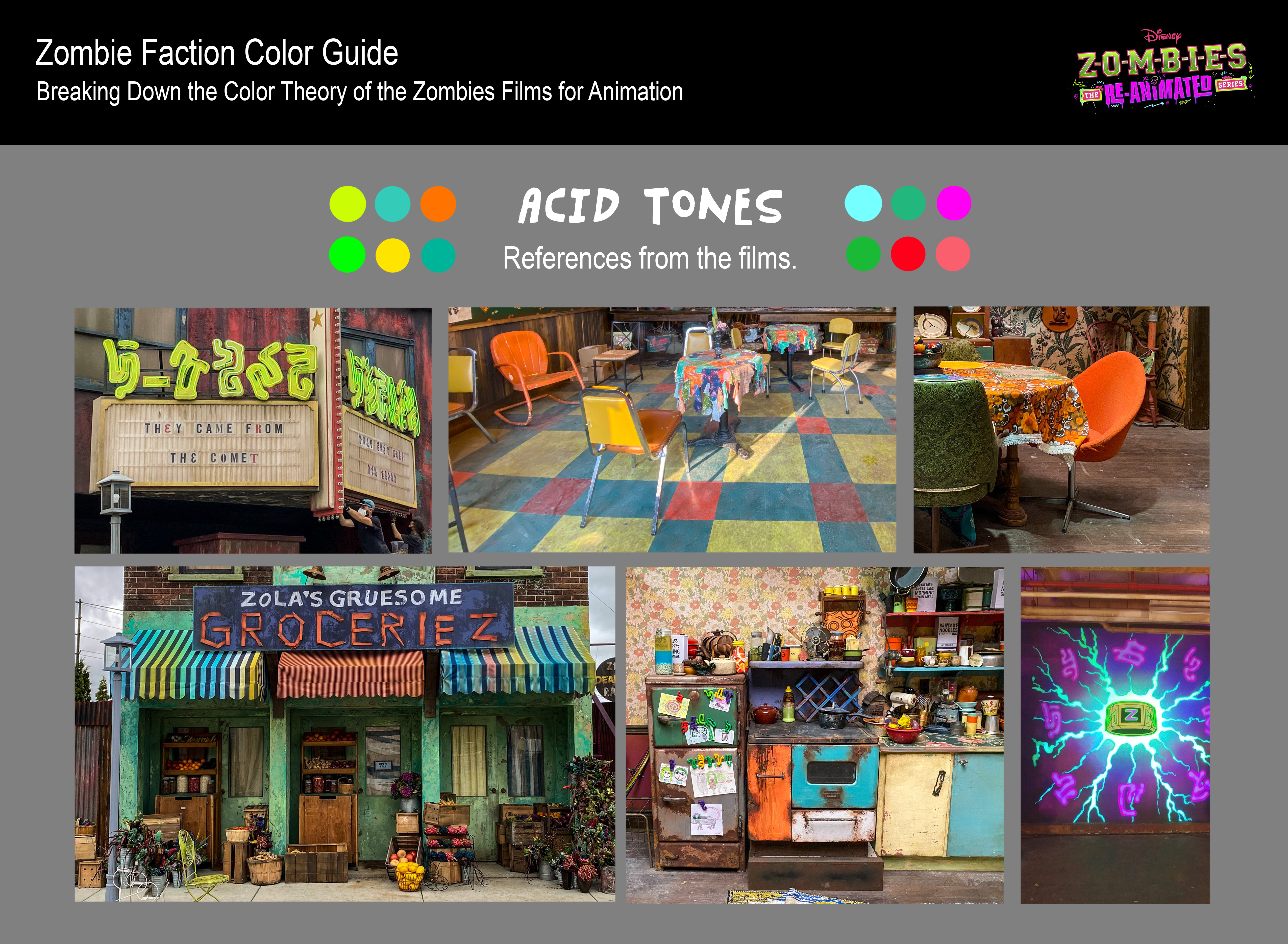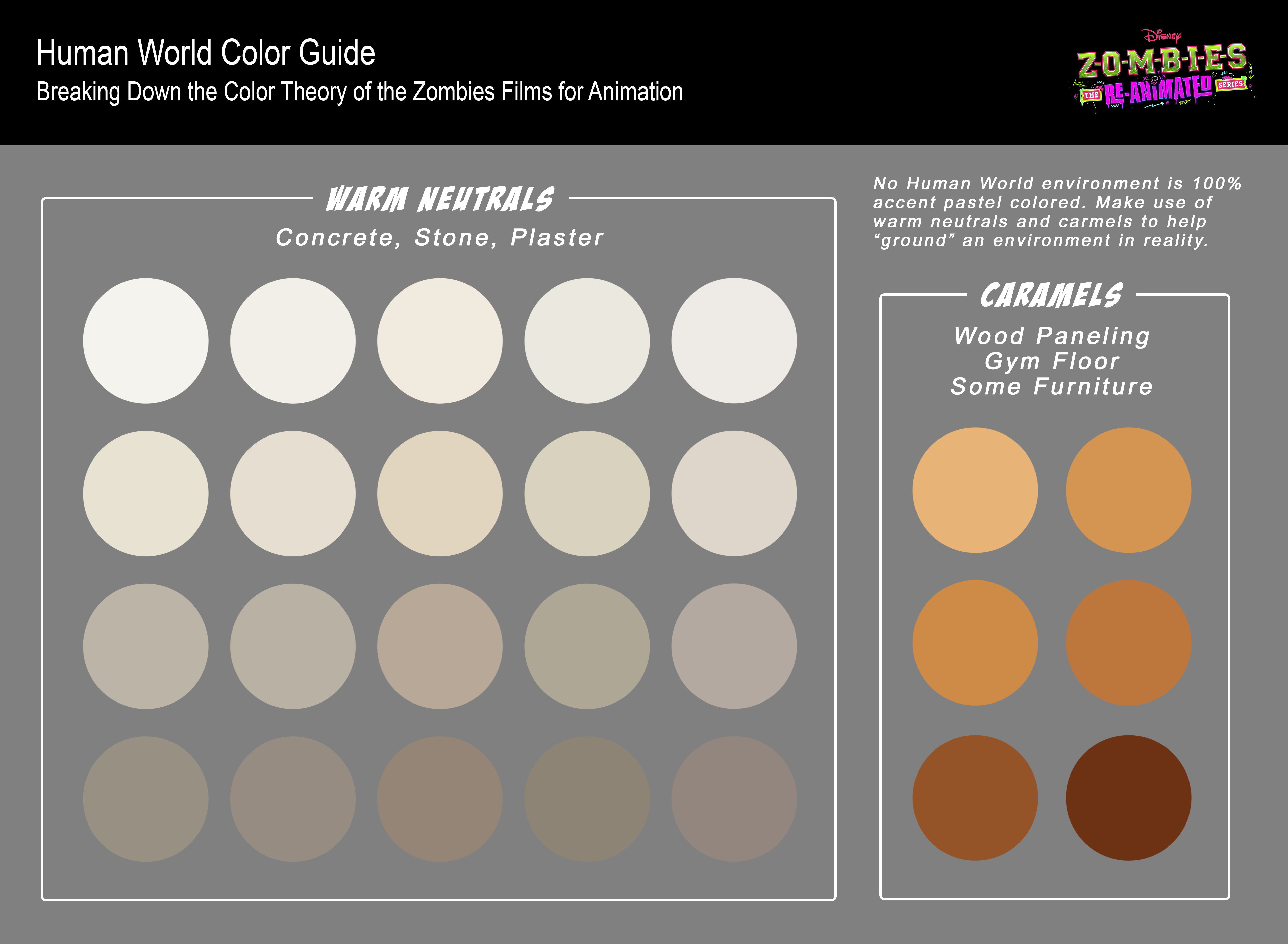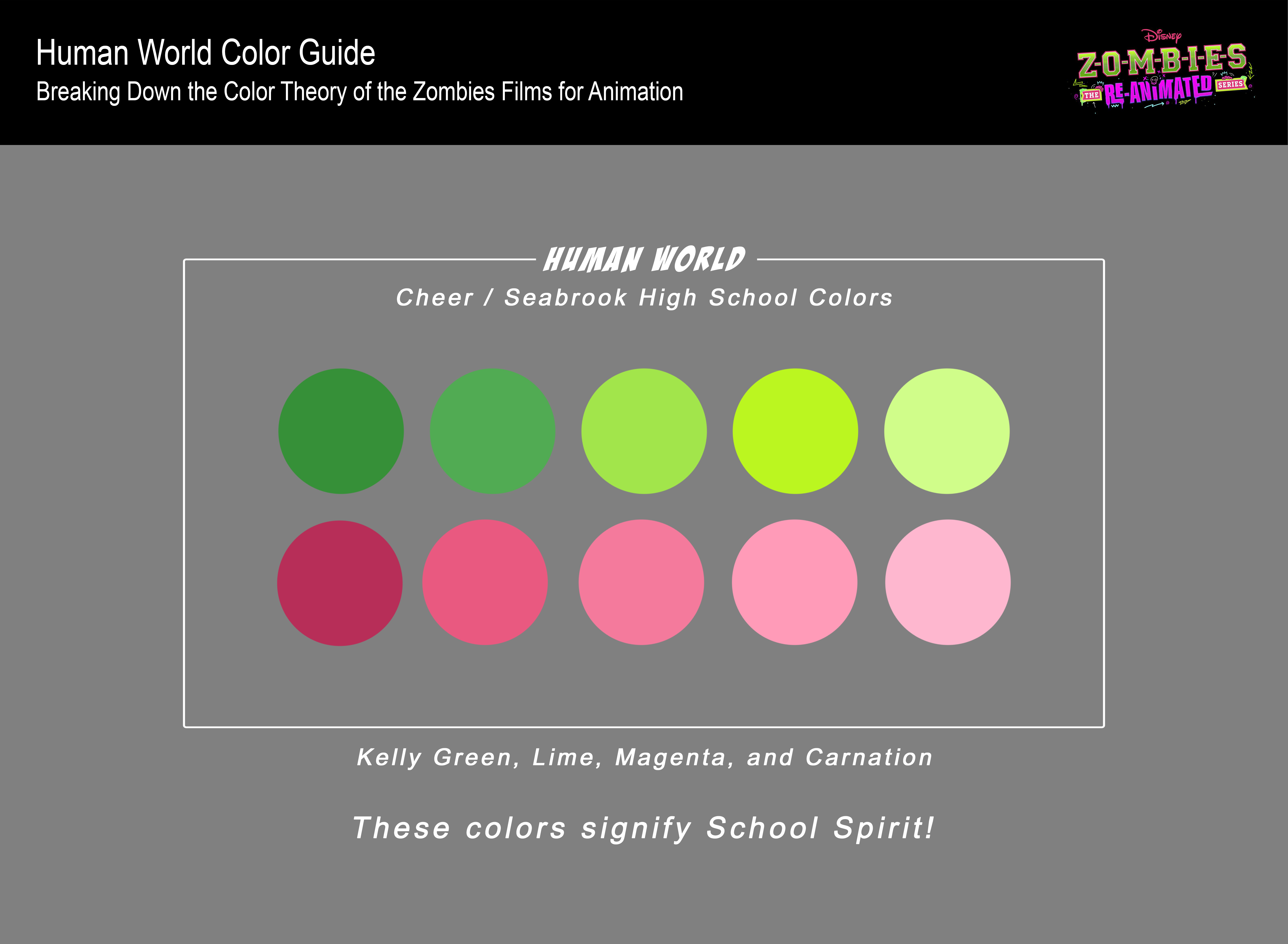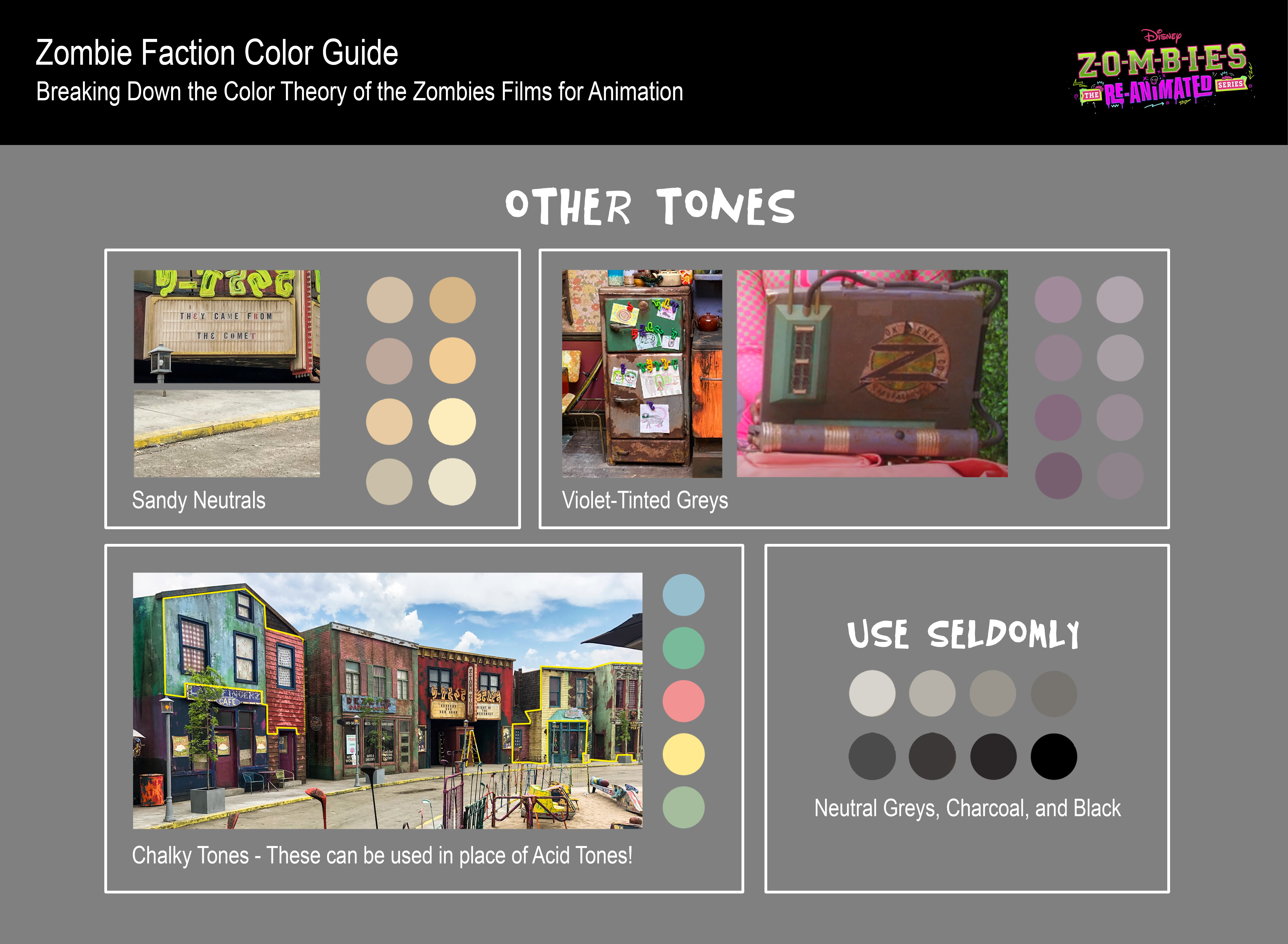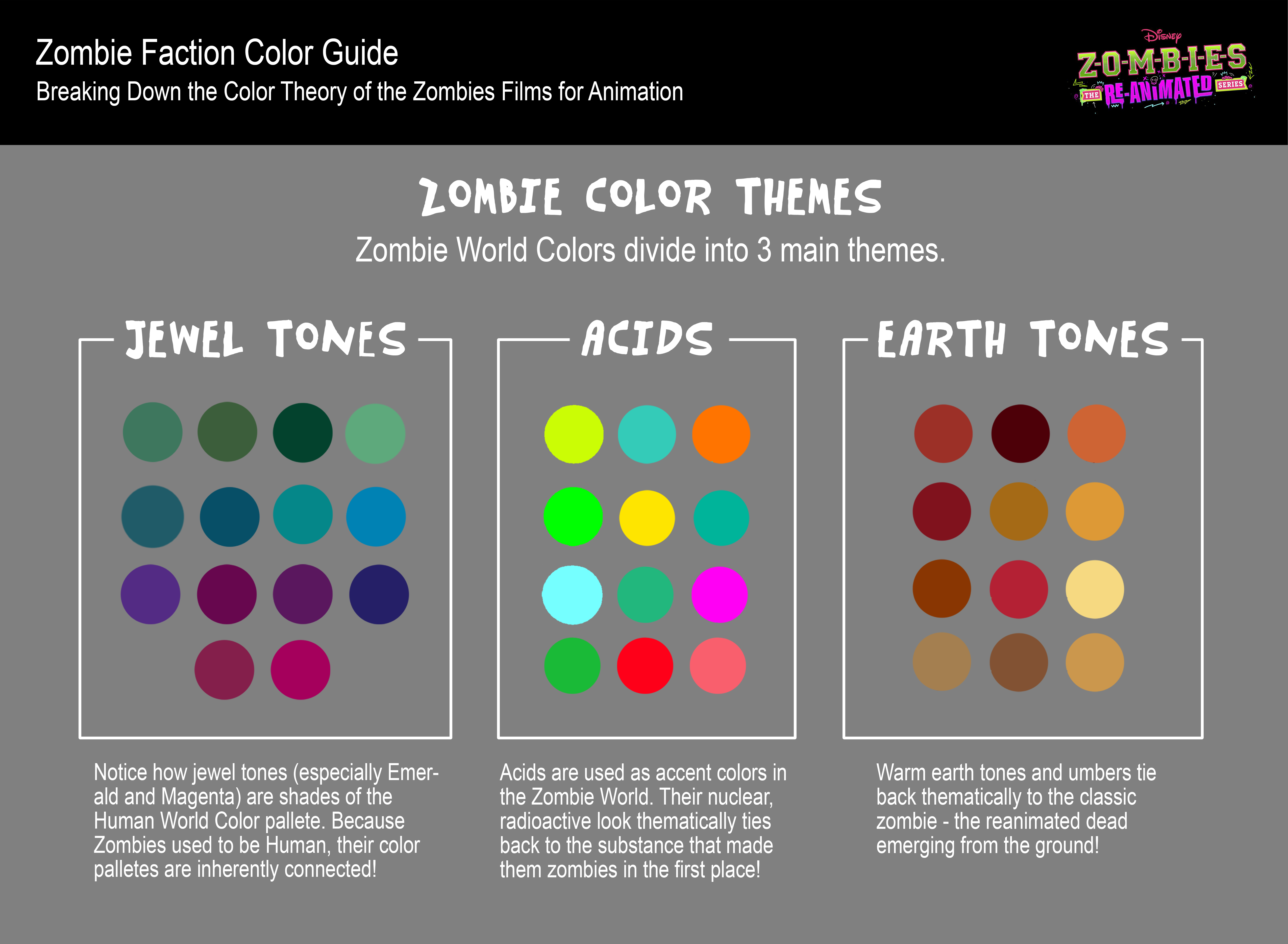 As we expanded the world of Zombies, it became clear we needed a unified color theory and design system to ensure each "faction" – Humans, Zombies, Werewolves, Aliens, and Witches – had distinct, instantly recognizable visual identities. I reverse-engineered the live action films’ color logic and created a series of color guides for our partner studio, removing as much guesswork as possible and helping streamline the design process.